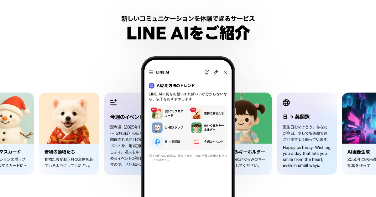 LINE AIは、友だちと話すようにメッセージをやりとりしたり、情報を収集したりできるサービスです。