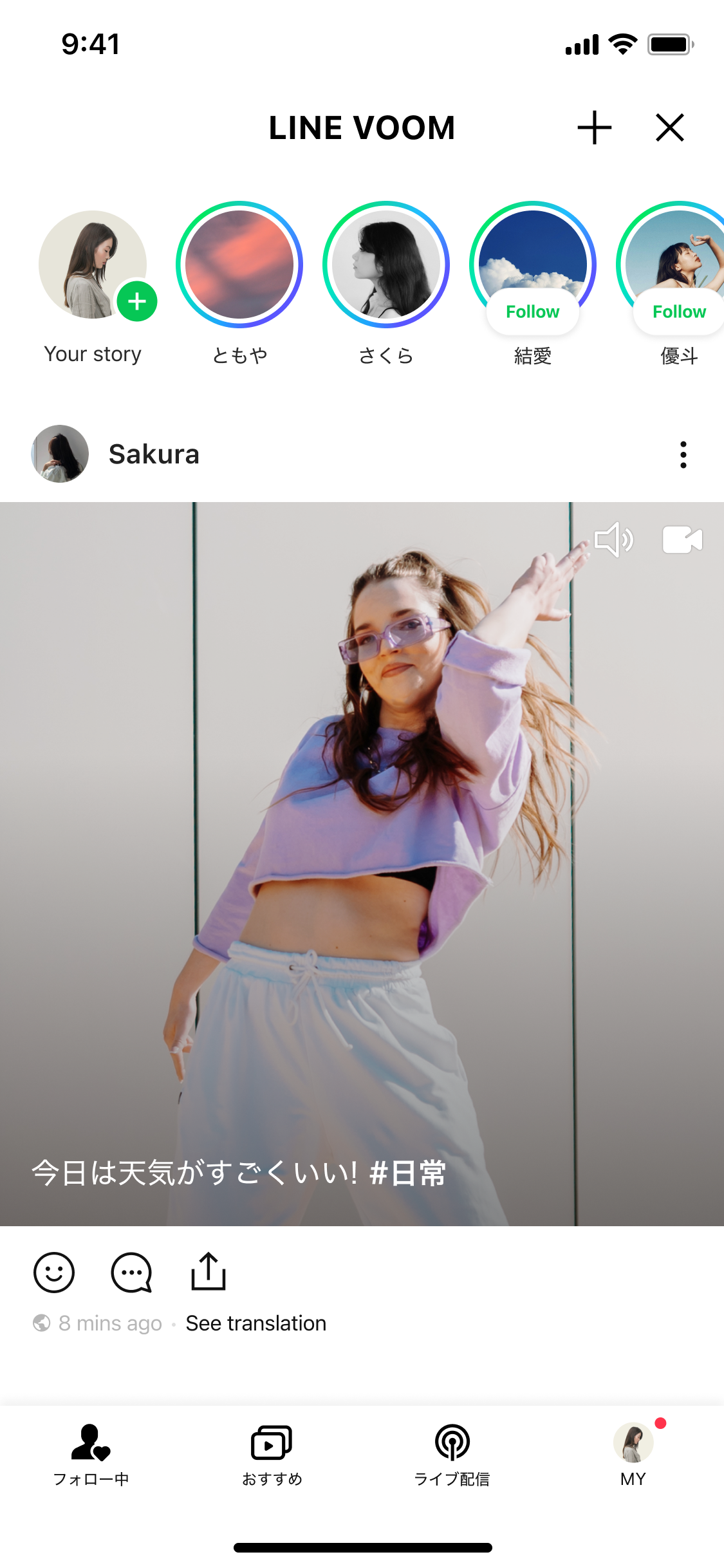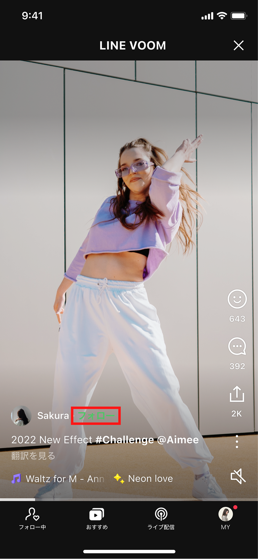 投稿されているVOOMの[フォロー]からフォローできます。フォローを解除するには[フォロー中]をタップしてください。